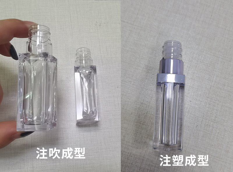液體口紅一般又叫唇彩、唇釉、唇泥,不同于固體口紅的是液體口紅會更加水潤,也會更持久,因此深受大家的喜愛,也逐漸成為市場熱銷品。承載液體口紅的口紅管大都是塑膠材料,塑膠材料通過注塑或者注吹兩種方式加工成型,兩者的區(qū)別主要在于,注塑是由兩個或以上的配件組裝而成,而注吹是一體成型的,不需要后續(xù)的組裝就能成為一個完整的瓶子,如下圖。今天誠邦化妝品包材注塑廠家就迎來了一個做彩妝的客戶,他們的設(shè)計理念是用注吹機一體成型,因此過來實地考察液體口紅管包材注吹定制過程。