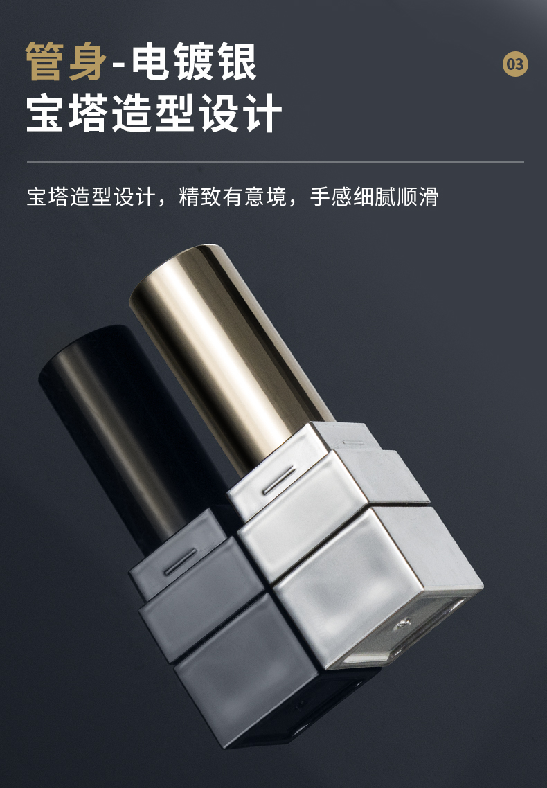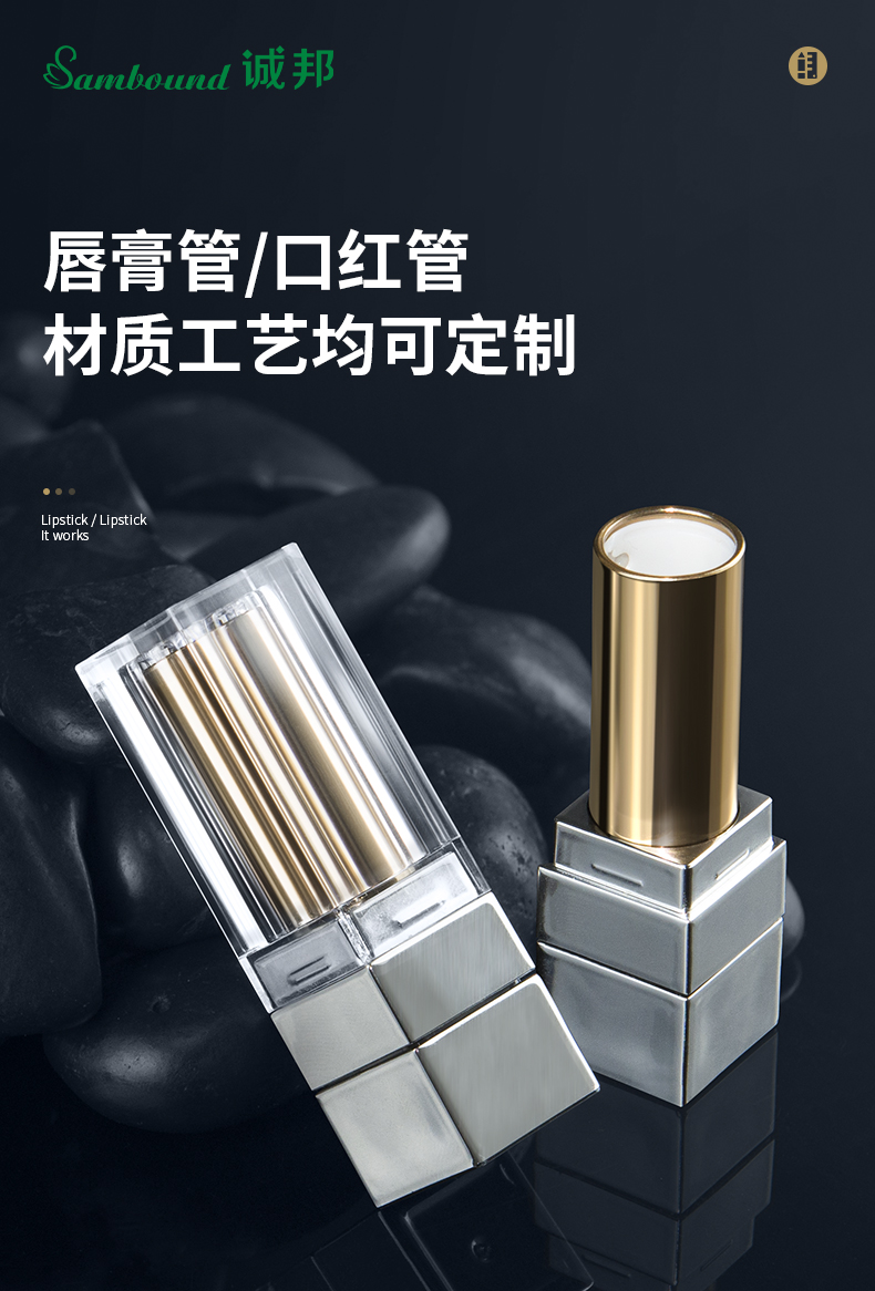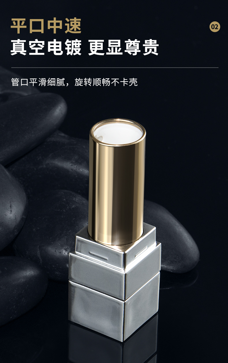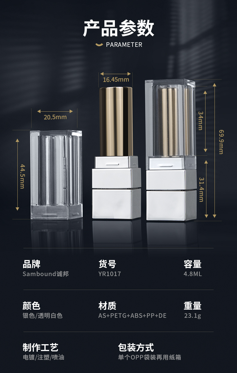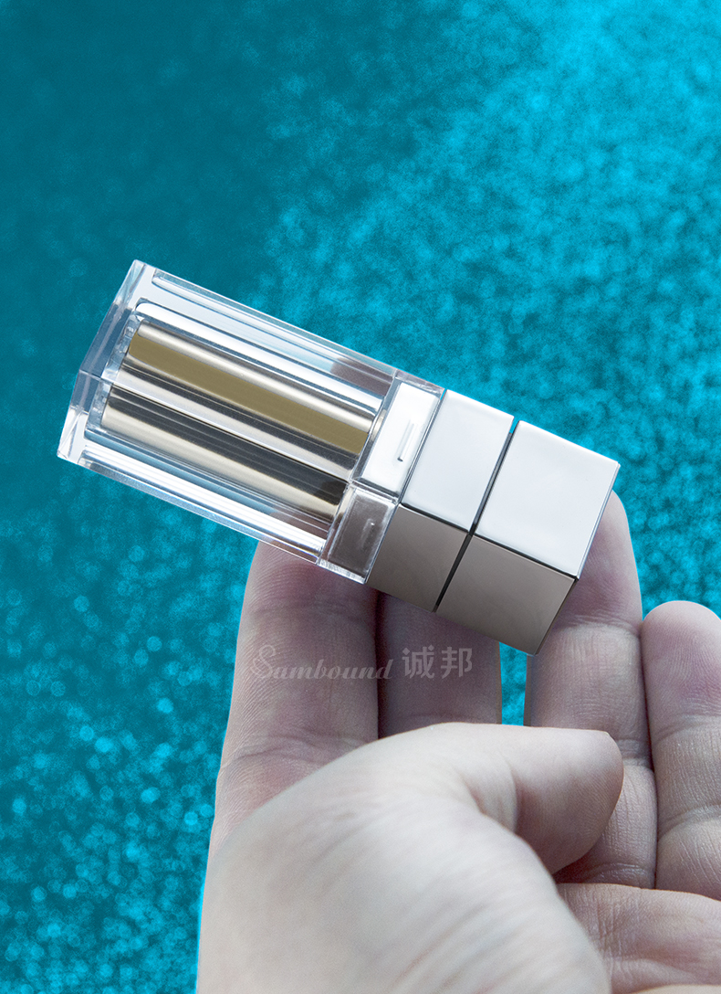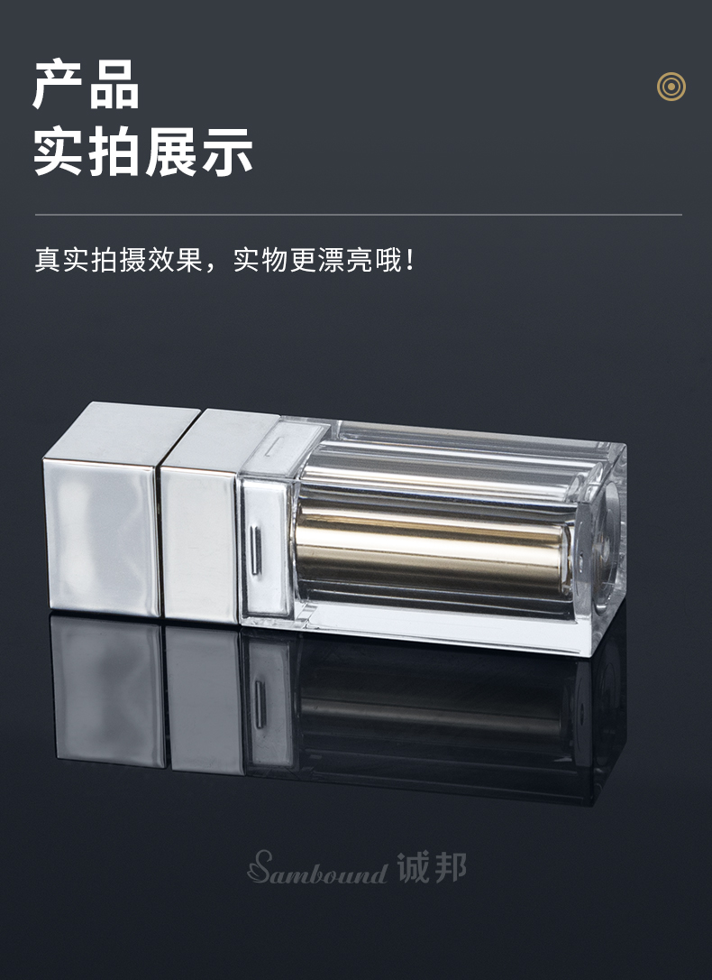 方形ABS塑膠口紅管空管,透明卡扣蓋子,管內(nèi)徑12 7mm,容量5ml,可按客戶不同表面處理工藝定制,工廠內(nèi)部完成電鍍,噴漆,絲印,燙金工藝。