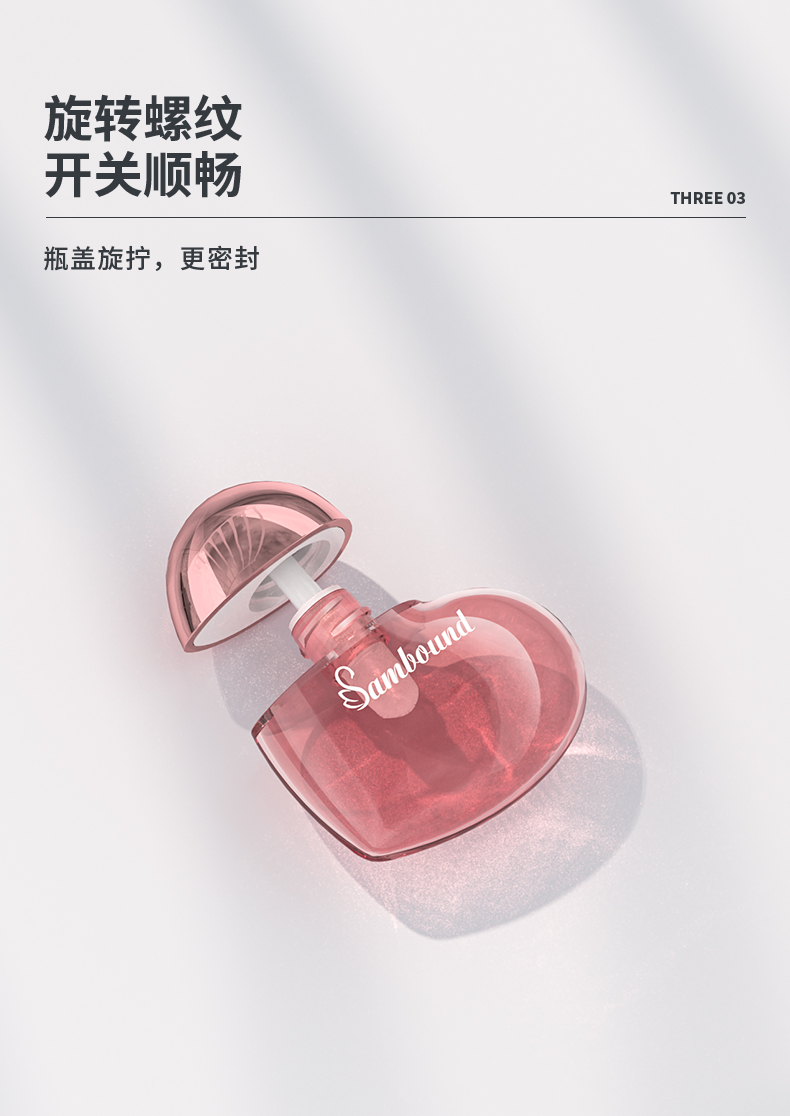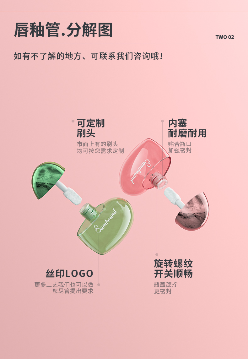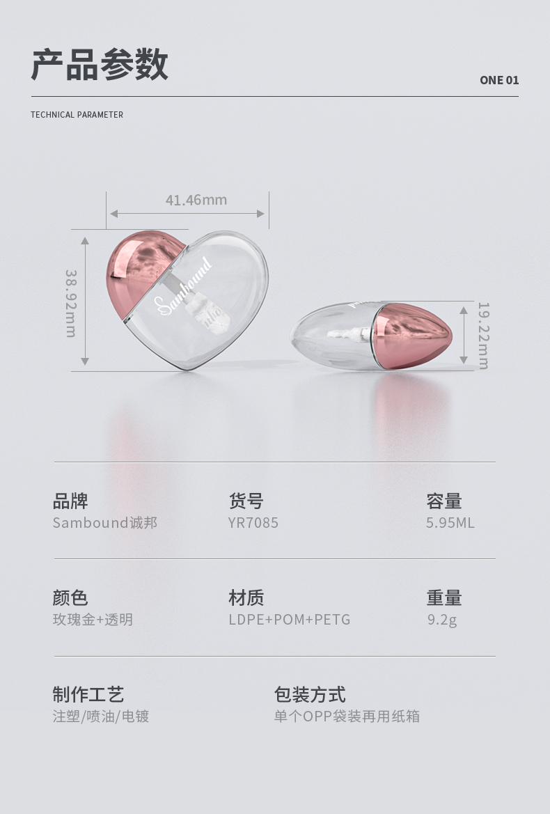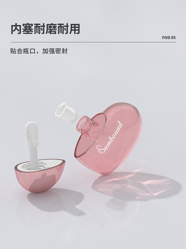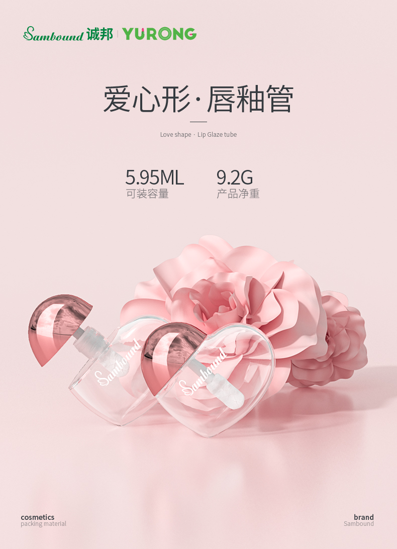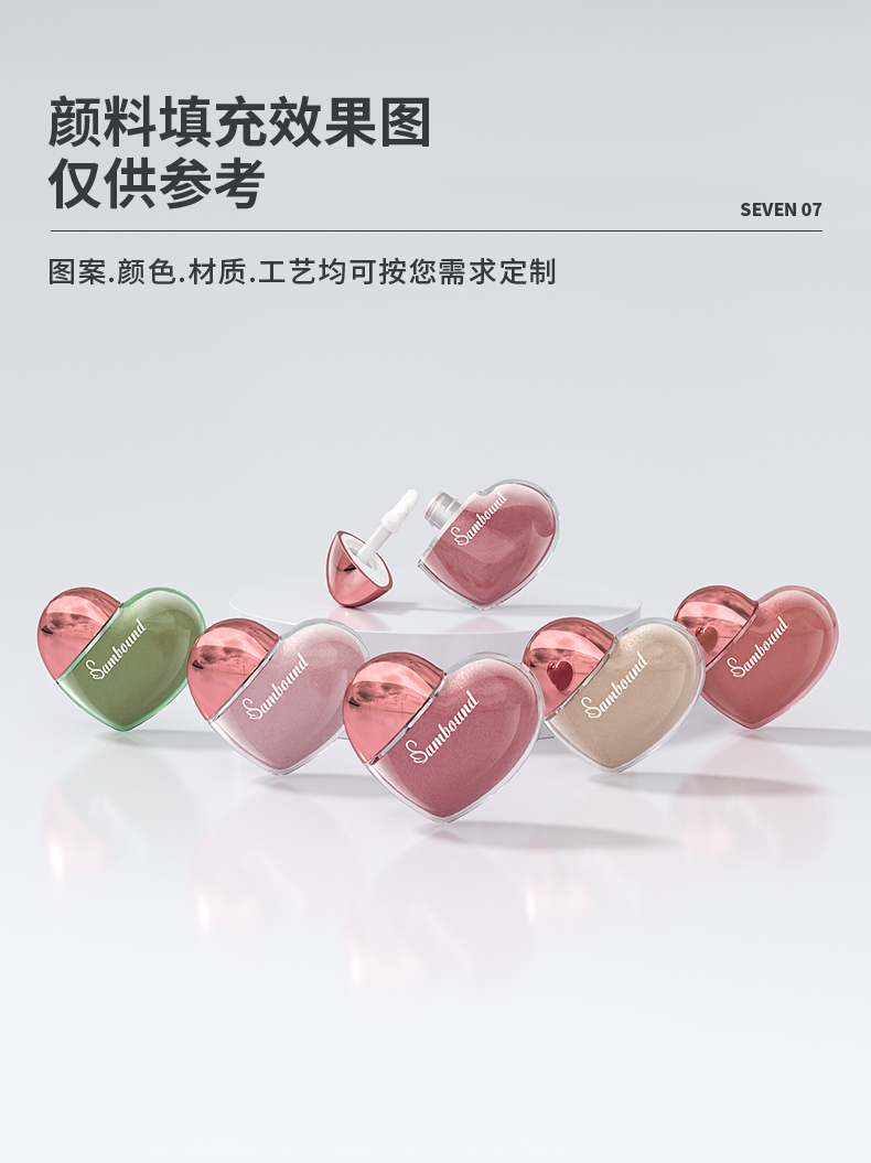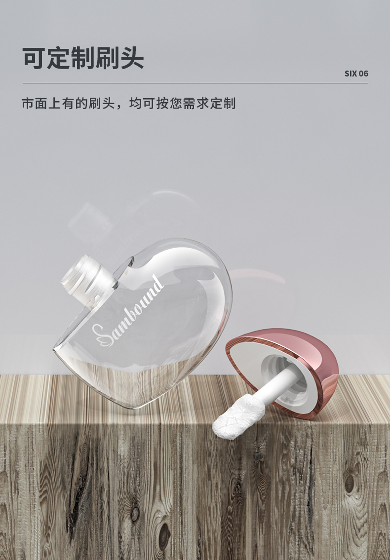 這款心形唇彩管特點(diǎn):6ml容量,瓶身注塑透明色,蓋子可以電鍍玫瑰金、銀色以及其他顏色,也可以定制logo,化妝品包材廠家直供,可以滿足各種自定義要求。