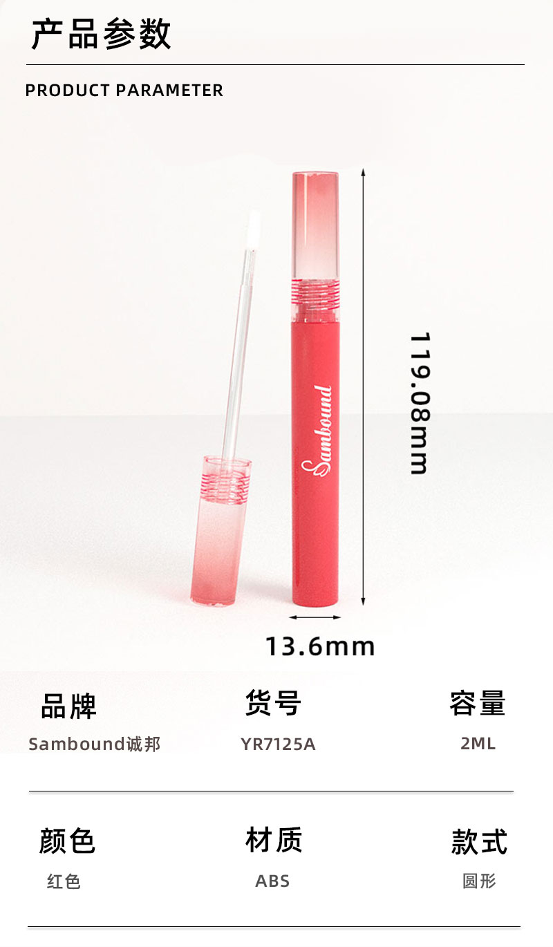 產(chǎn)品名稱唇彩包材產(chǎn)品貨號YR7125容量2ML顏色紅色-可定制材質ABS重量32 9g制做工藝注塑包裝方式單個OPP袋裝再用紙箱