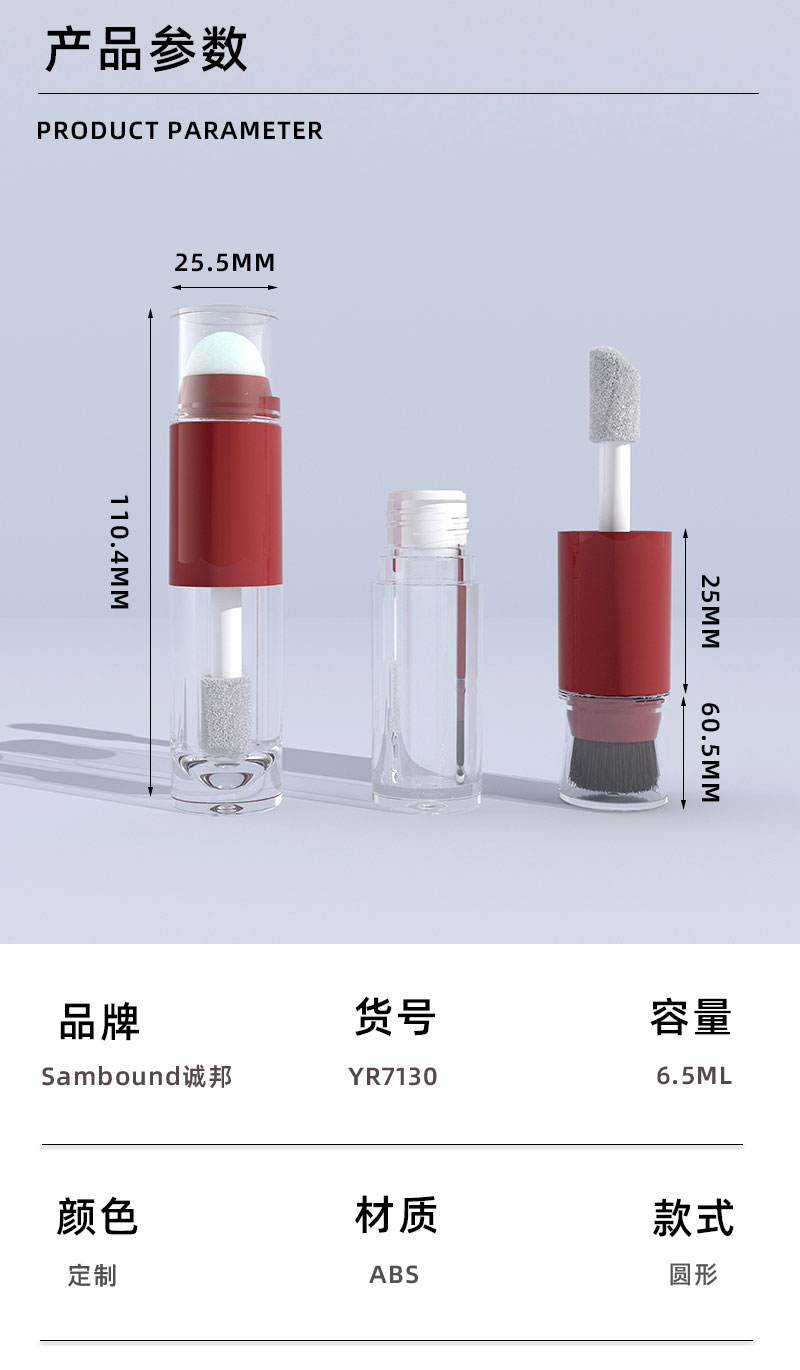 產(chǎn)品名稱唇釉管包材產(chǎn)品貨號YR7130容量6ML顏色可定制材質(zhì)ABS重量32 9g制做工藝注塑 噴油 真空電鍍包裝方式單個OPP袋裝再用紙箱