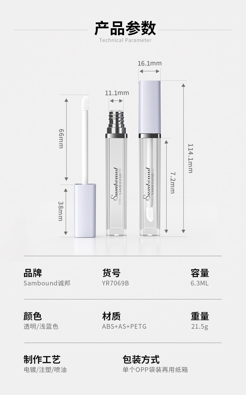 方形唇彩管空管,噴漆蓋子,中束電鍍銀色,可接客戶設(shè)計(jì)圖稿絲印LOGO,橡膠刷頭,免費(fèi)打樣
