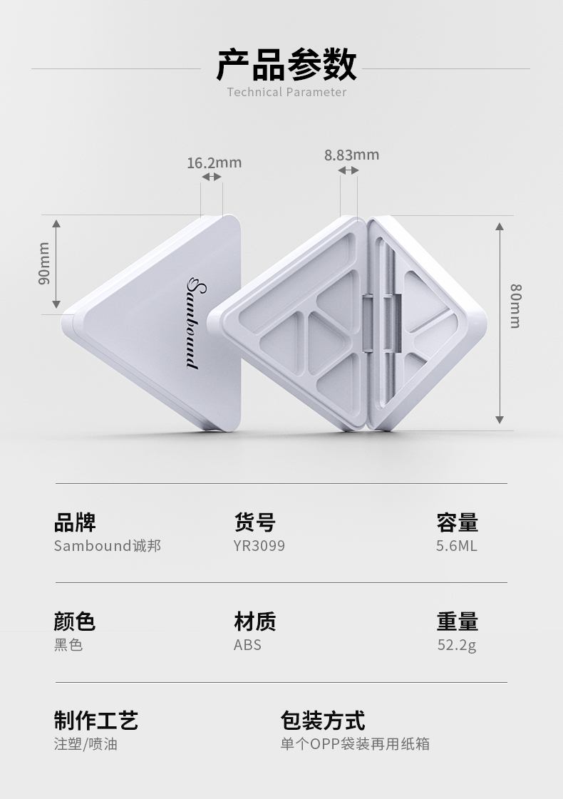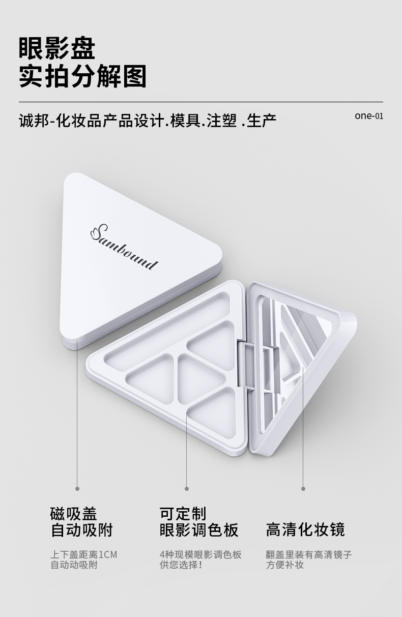 這款三角形磁吸眼影盤特點(diǎn):獨(dú)特的三角形外觀、磁吸開關(guān)設(shè)計(jì)、可定制logo圖案
