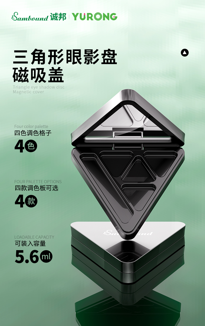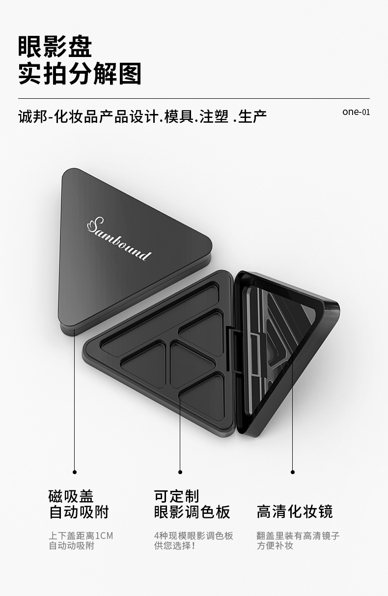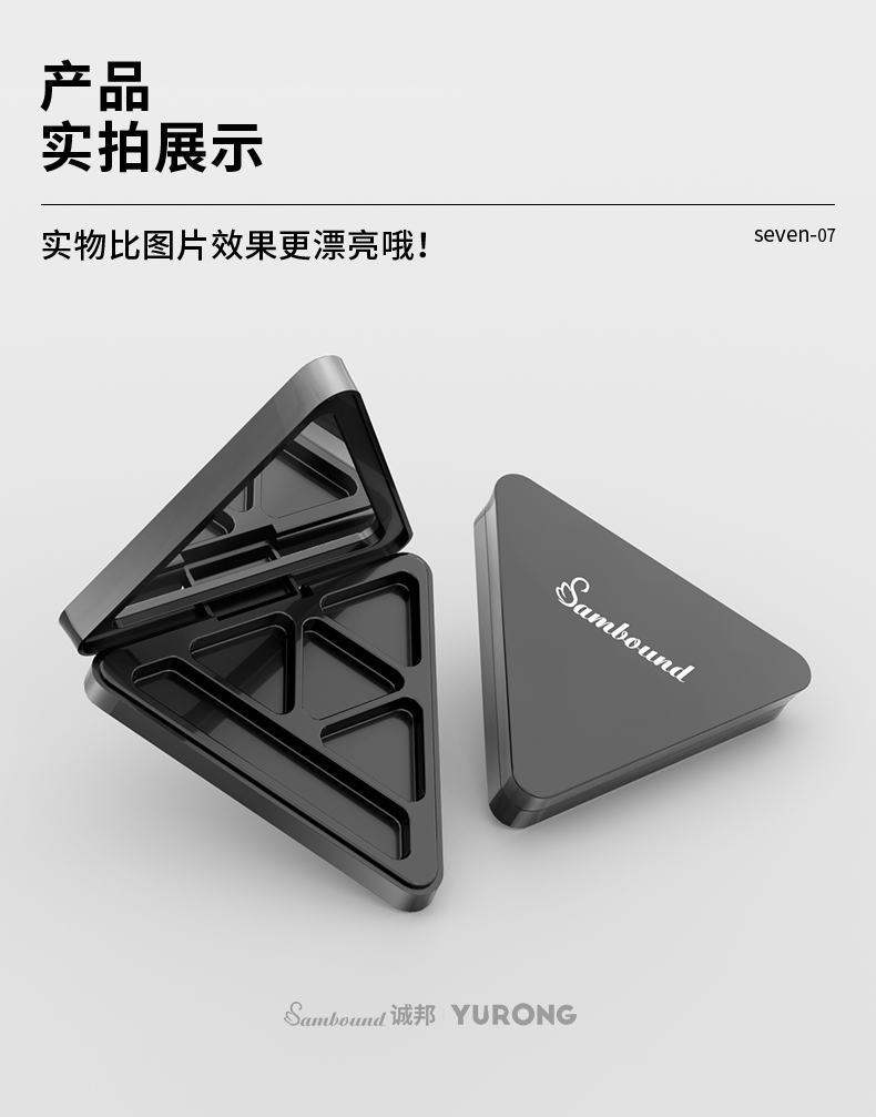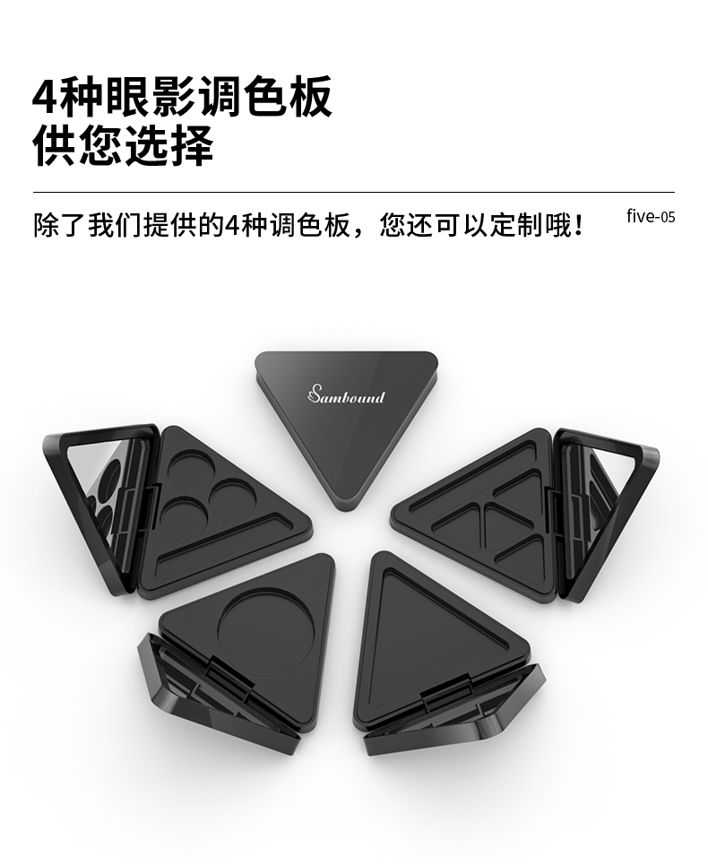 這款空磁吸三角形眼影盤彩妝包材可定制logo、顏色,有4種內(nèi)格可選,內(nèi)帶高清化妝鏡,磁吸開關(guān)更方便,公模加工定制廠家
