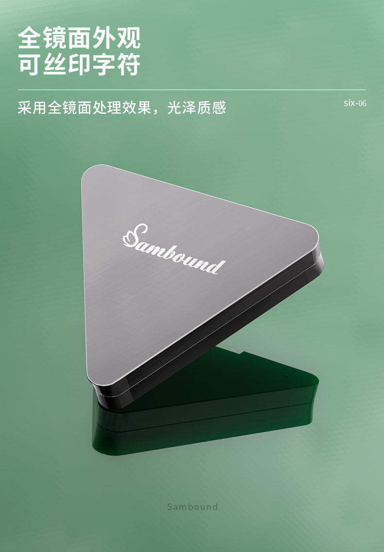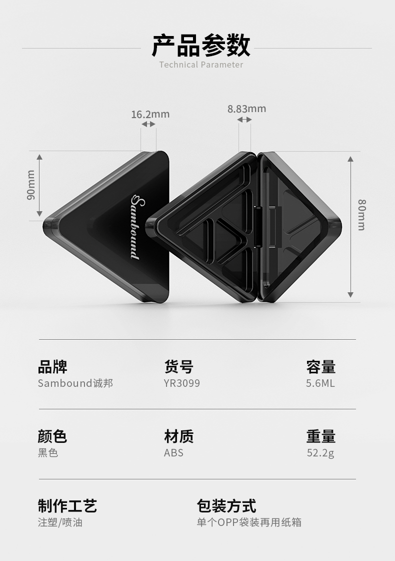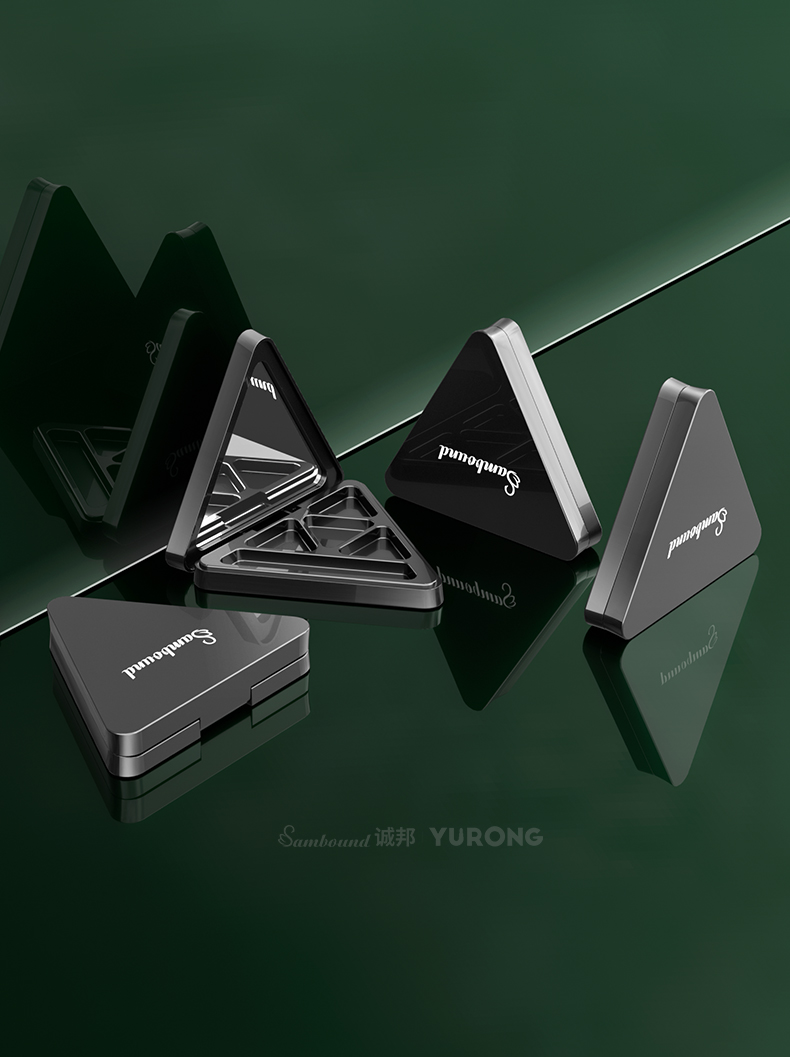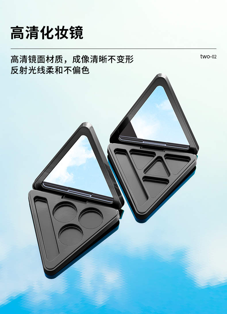 這款空磁吸三角形眼影盤彩妝包材可定制logo、顏色,有4種內(nèi)格可選,內(nèi)帶高清化妝鏡,磁吸開關(guān)更方便,公模加工定制廠家