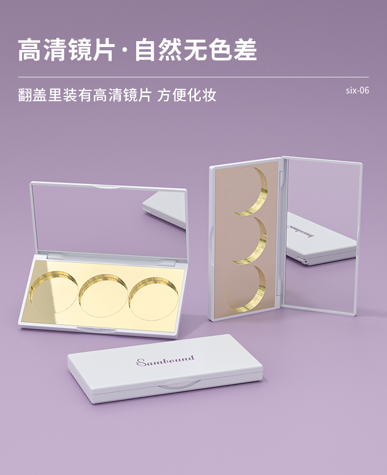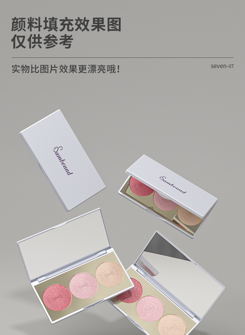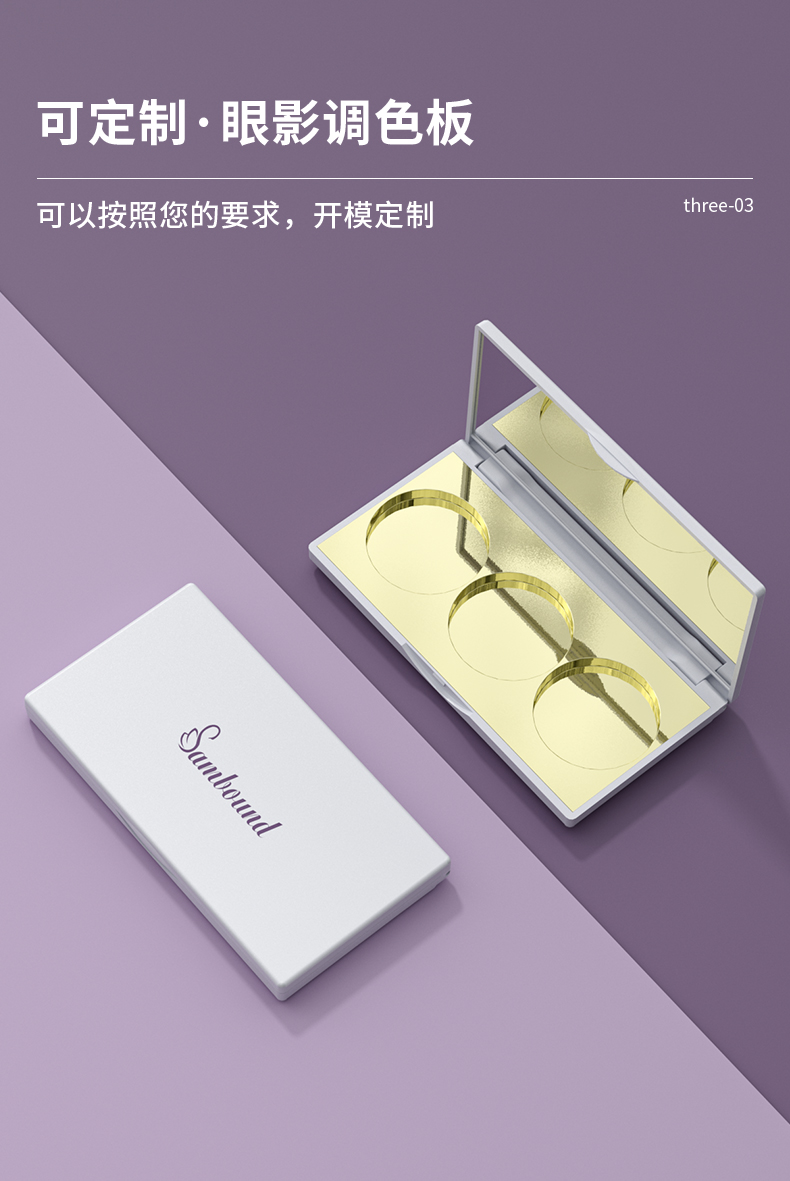眼影盤包材特點:高光修容鼻影3色圓形眼影一體盤,采用電鍍色,也可定制顏色和logo,免費提供樣品