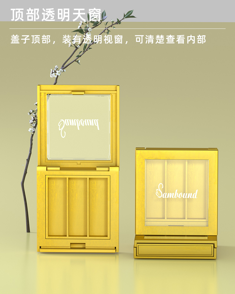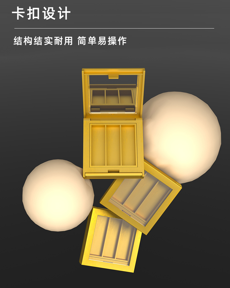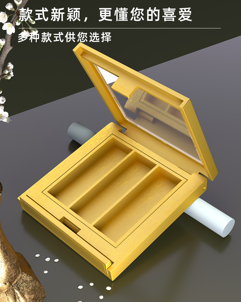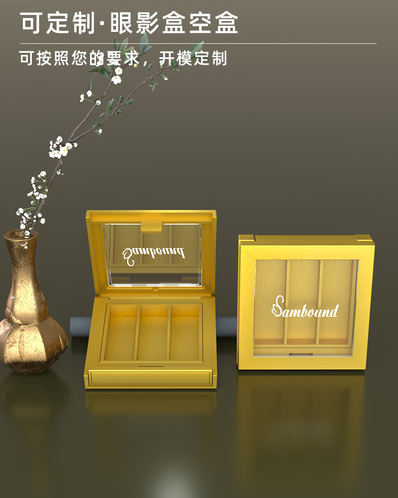 產(chǎn)品名稱眼影盒包材產(chǎn)品貨號(hào)YR8009bcc59*63顏色金色-可定制材質(zhì)ABS內(nèi)盒13*43制做工藝注塑 噴油 真空電鍍包裝方式單個(gè)OPP袋裝再用紙箱